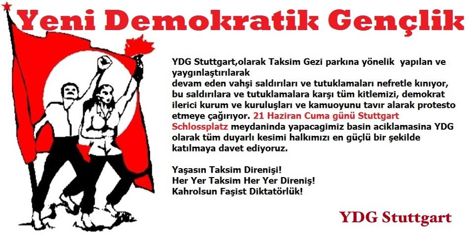 YDG Stuttgart olarak Taksim Gezi parkına yönelik yapılan ve yaygınlaştırılarak devam eden bu vahşi saldırıları ve tutuklamaları nefretle kınıyor, bu saldırılara ve tutuklamalara karşı tüm kitlemizi, demokrat ilerici kurum ve kuruluşları ve kamuoyunu tavır alarak protesto etmeye çağırıyor. 21 Haziran’da Stuttgart´ın Schlossplatz meydanında saat 18.00 de yapacağımız basın açıklamasına YDG olarak tüm duyarlı kesimi halkımızı en güçlü bir şekilde katılmaya davet ediyoruz.