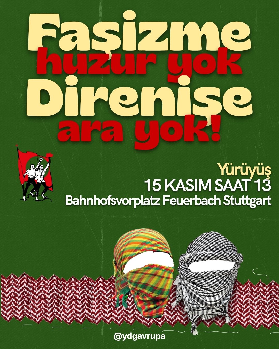 Yeni Demokratik Gençlik olarak, 15 Kasım’da Stuttgart Feuerbach Bahnhof’ta gerçekleştirilecek eylemde; tüm antifaşist, ilerici ve devrimci gençliği, faşizme ve savaş politikalarına karşı omuz omuza mücadeleye çağırıyoruz!