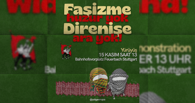 Yeni Demokratik Gençlik olarak, 15 Kasım’da Stuttgart Feuerbach Bahnhof’ta gerçekleştirilecek eylemde; tüm antifaşist, ilerici ve devrimci gençliği, faşizme ve savaş politikalarına karşı omuz omuza mücadeleye çağırıyoruz!