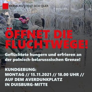 Tausende Geflüchtete warten in Belarus an der polnischen Grenze darauf, in der EU anzukommen. Die polnische Regierung, die den Geflüchteten den Krieg erklärt hat, hat die Grenzen mit Zäunen geschlossen und etwa 12.000 Soldaten an Grenzübergängen zusammengezogen. Wir müssen dringend handeln, um das Leben von Geflüchteten zu retten, die aus Kriegsgebieten geflohen sind und an der polnisch-belarussischen Grenze festgehalten werden! Die EU lässt Kinder, Frauen und Männer vor den Toren Europas verhungern und erfrieren! Wir rufen dazu auf, sich mit den Geflüchteten zu solidarisieren und die Forderungen der Geflüchteten auf die Straße zu tragen!