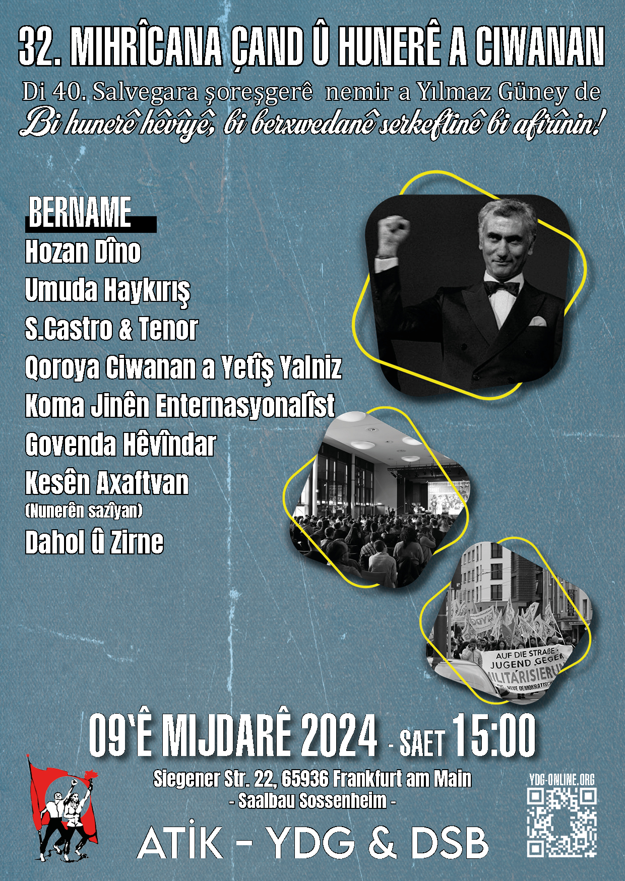 40.salvegera Şoreşgerê nemir Yılmaz Guney de: Bi hunerê hêviyê, bi berxwedanê serketinê bi afirîne!” Werin em di 32. Mîhrîcana çand û hunerê a ciwanan a YDG’de bi vê dirûşmê em bigihijîn hev.